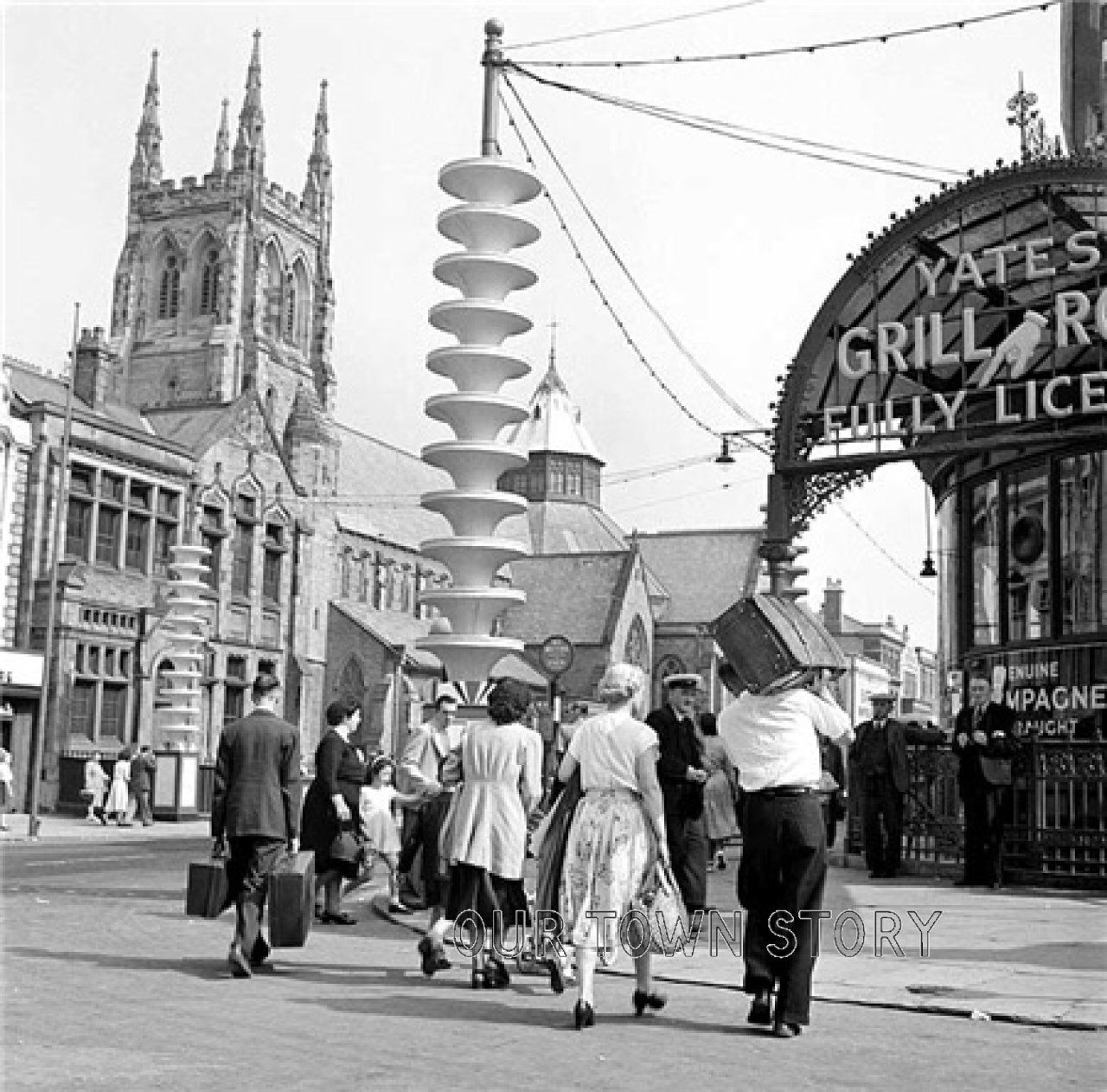 Holidaymakers make their way from the Promenade towards Talbot Road Station on the London & North Western Railway. The Church of the Sacred Heart...