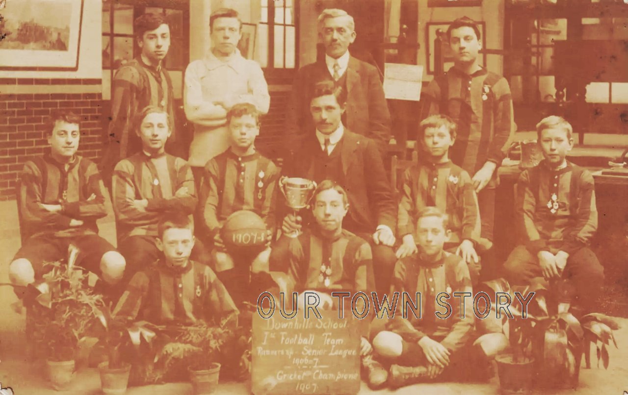 The apparently victorious Downhills School football team celebrating 1908. They were runners up the previous year, as well as Cricket Champions....