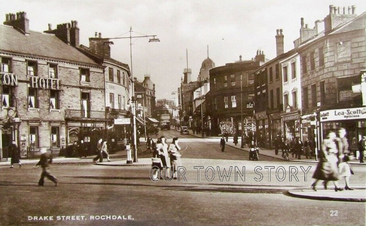 The Wellington on the left is still there, and the opticians on the right is now a Dallas Fried Chicken. The domes on the buildings up Drake Street...