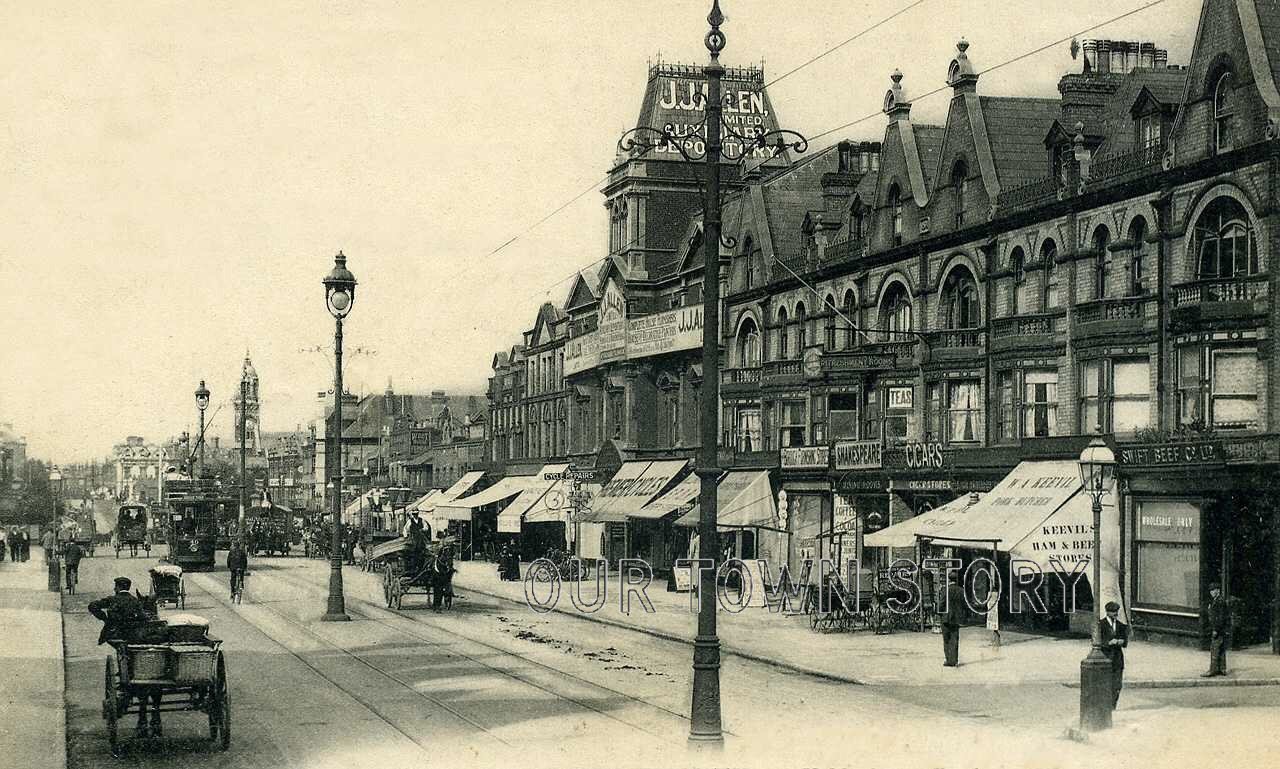 Taken looking north along Holdenhurst Road, showing J J Allen's Depository, along with the many shops fronting the street. Shops discernible...