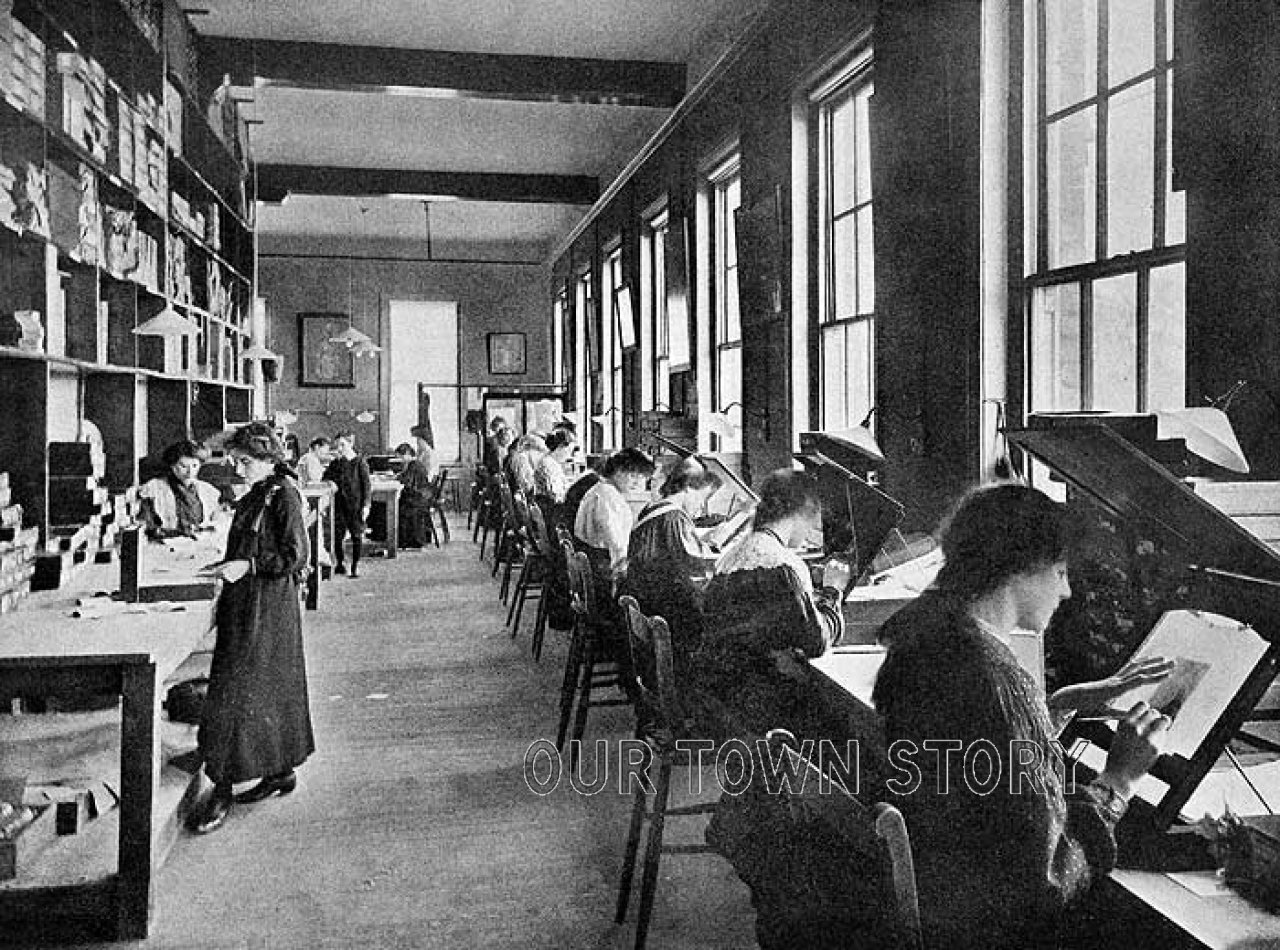This photograph taken in the Developing and Printing Department shows women retouching glass negatives. Taking photographs was becoming far more...