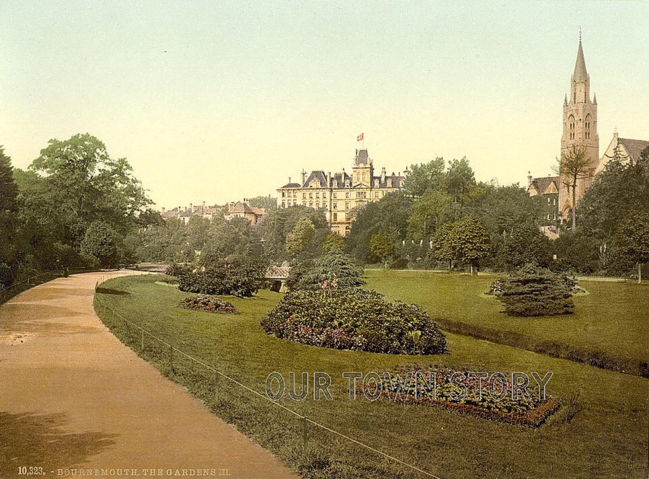 View of the gardens in central Bournemouth, with St. Stephen's in the background. The photo uses the Photochromic technique to simulate real...