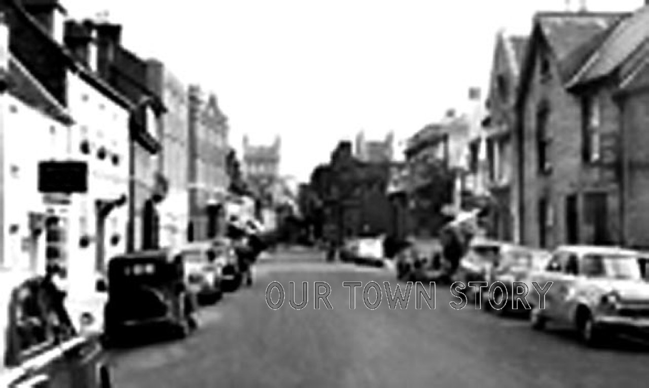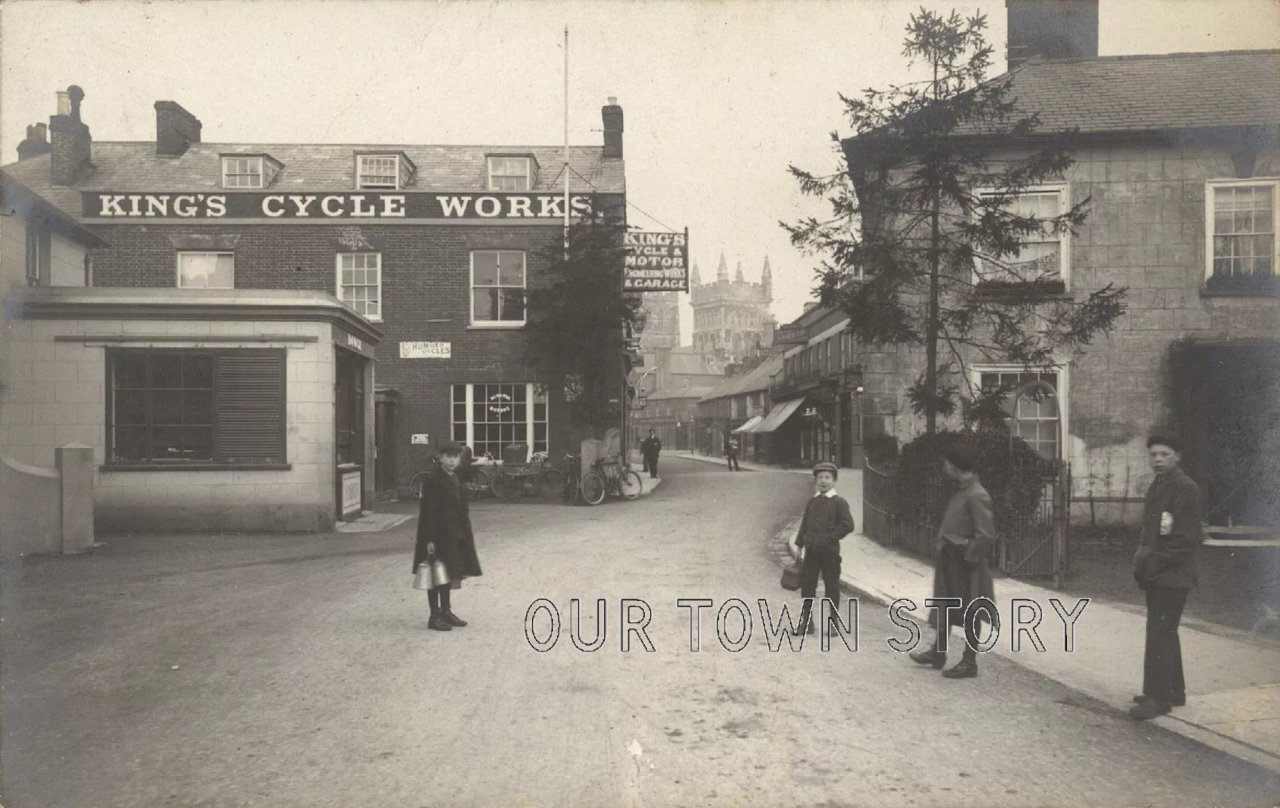 Looking down West Street towards the Square, past the King's Head Hotel (and Stables!). The hardware shop on the right with the tin baths and...