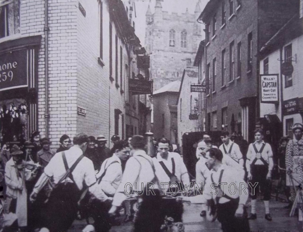 Taken from the end of School Lane looking towards the Minster. Possibly a coal delivery taking place on the left-hand side.