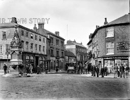 Looking towards the street from Hart Street, with the drinking fountain of 1885 in porphyry and stone with a short crocketed spire, to the...